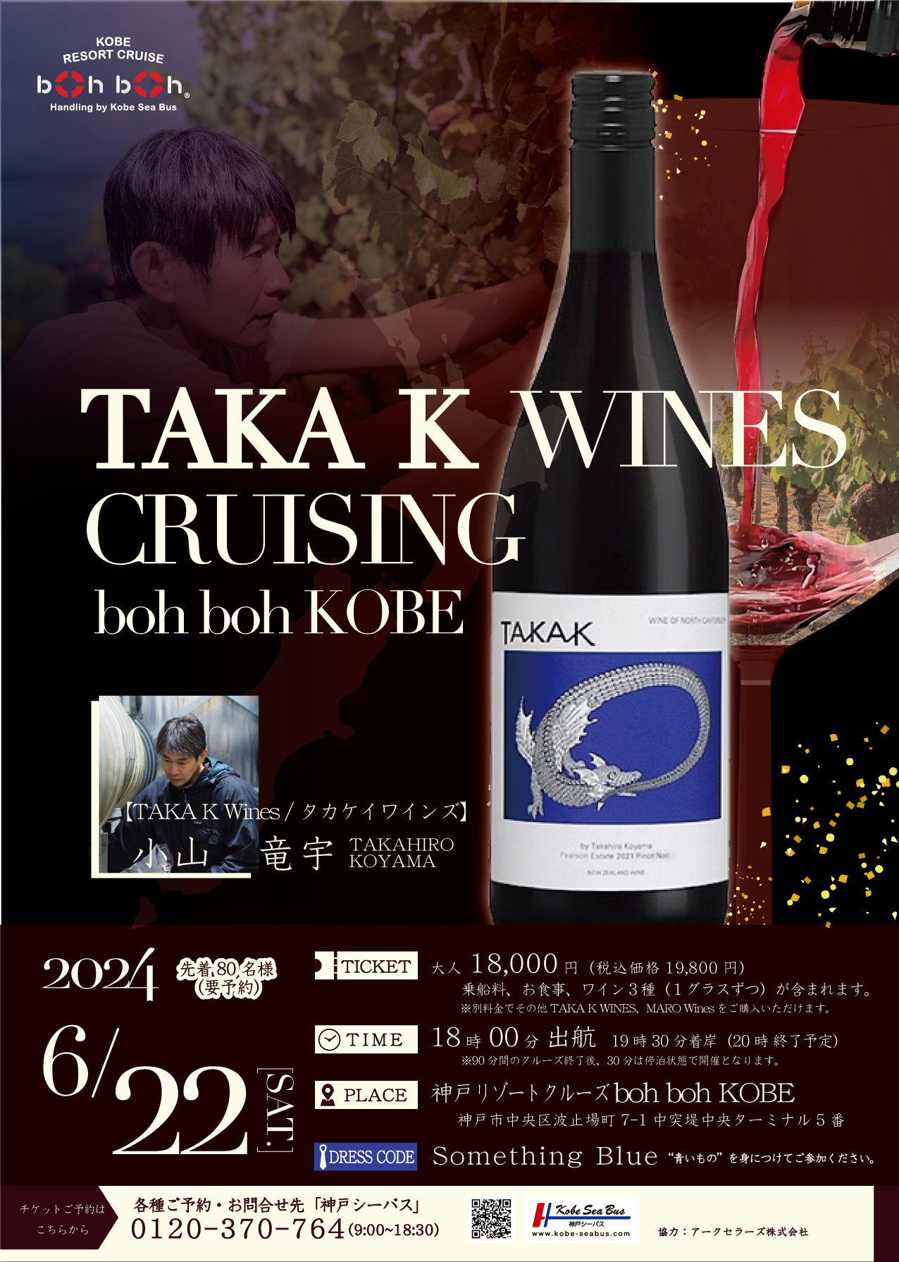 世界最高峰のワインを堪能できる『TAKA K WINES CRUISING』をboh boh KOBEで開催! 日本人醸造家の小山竜宇×麿直之が織りなす贅沢なディナータイムを船上で