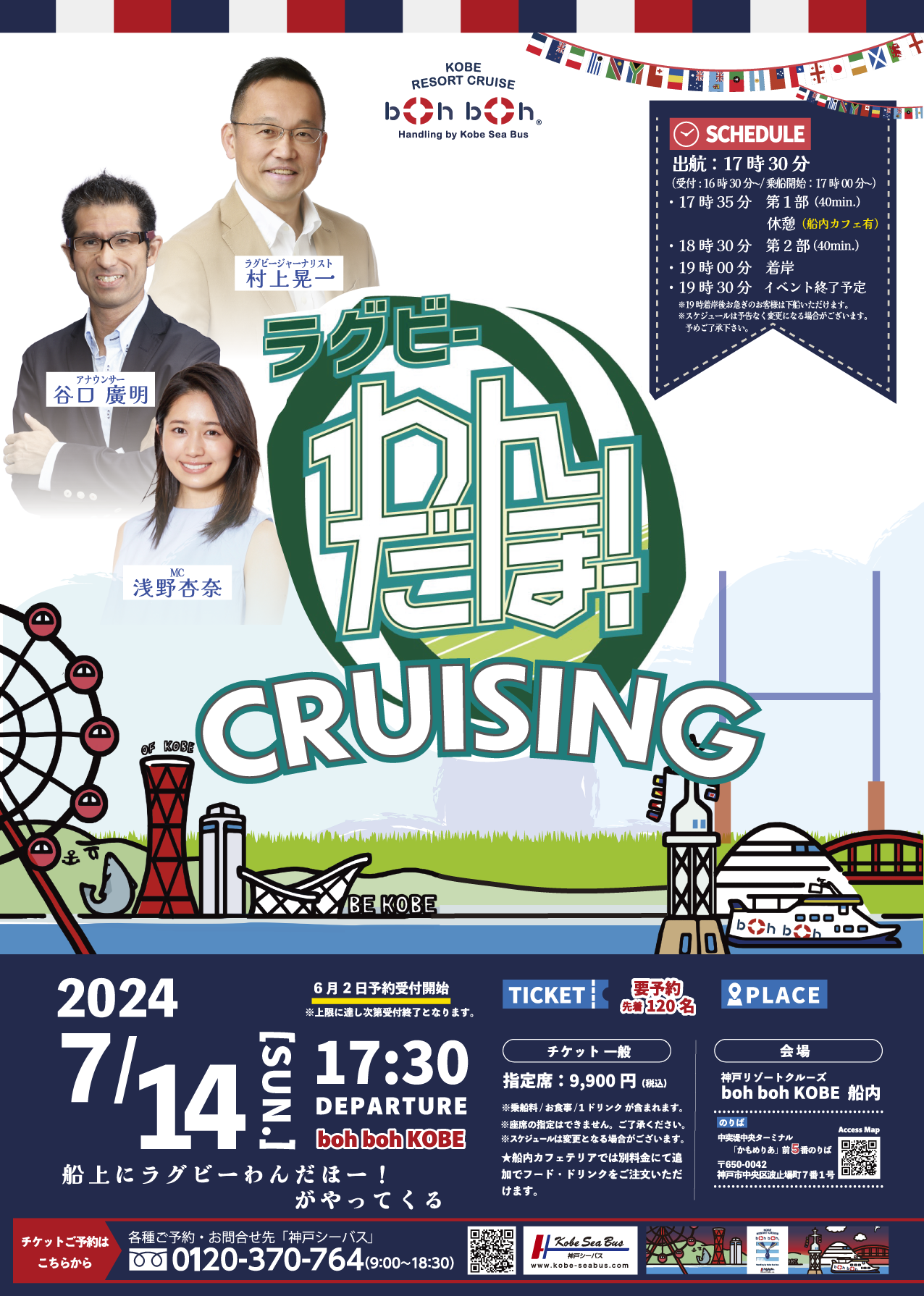 2024年7月14日神戸の観光船boh boh KOBEに JSPORTSラグビー情報番組「ラグビーわんだほー!」がやってくる!船上では<初>の単独イベント『ラグビーわんだほー!CRUISING』開催